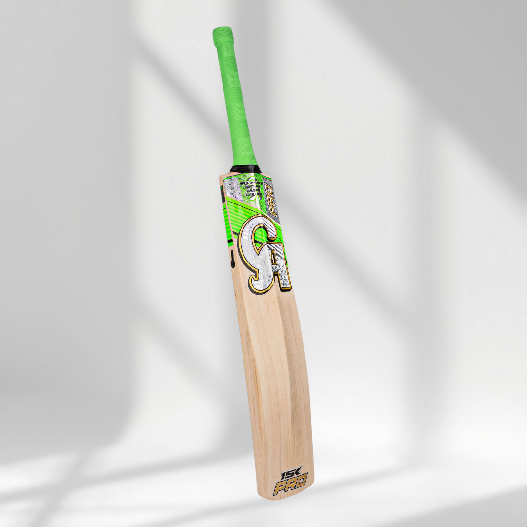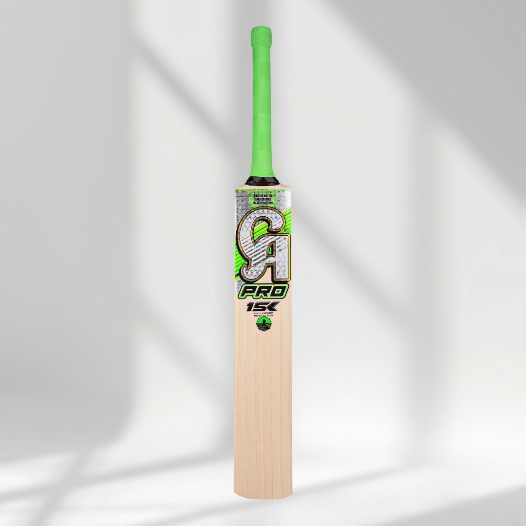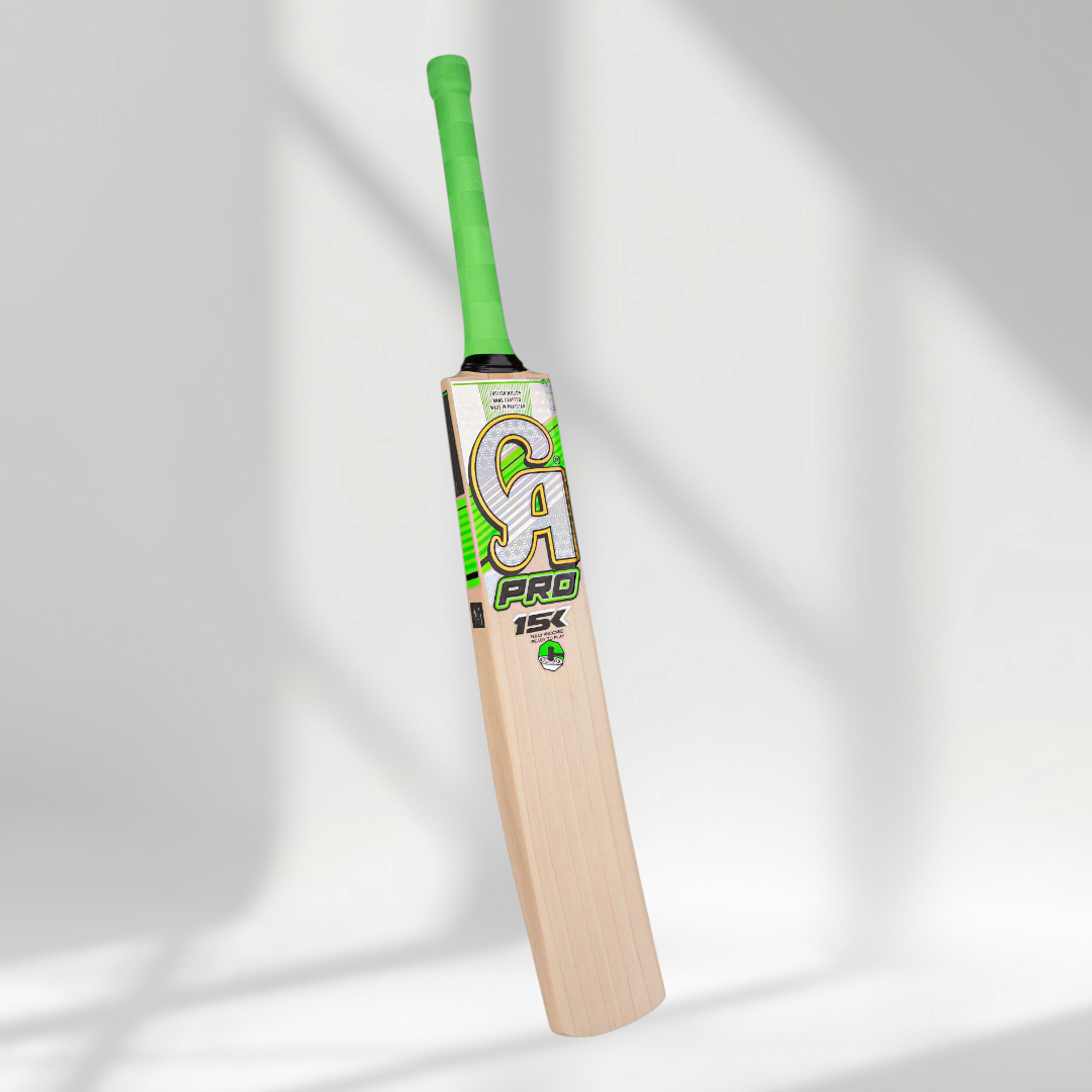 The CA Pro 15K English Willow Bat is designed for professional and advanced players who demand the very best from their gear. Crafted from hand-selected English willow with minimum 6-7 grains straight grains, this bat delivers a powerful combination of strength, balance, and precision. Its mid-to-low sweet spot, thick edges, and elevated spine make it a perfect choice for aggressive stroke makers. The three-piece cane handle, paired with an ergonomic grip, provides shock absorption and ensures excellent control over every shot. Enhanced with 3D embossed CA stickers and fine finishing, the Pro 15K is as stylish as it is powerful. Ideal for players who want unmatched performance and durability in competitive cricket.